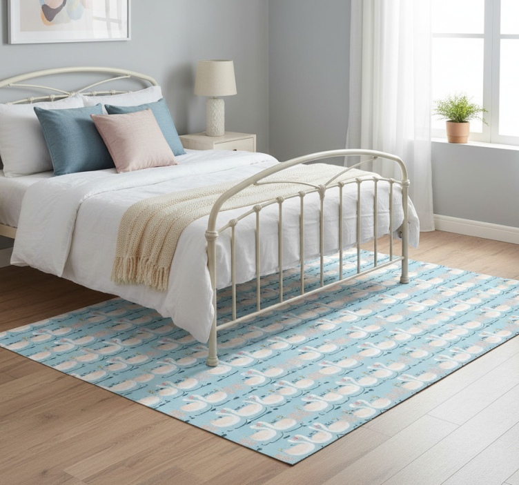 The Bedroom vinyl rug with swans in love on blue bedroom vinyl rug is more than just a floor covering; it's a piece of art that uplifts your decor. Imagine stepping into a room adorned with this enchanting rug, where love and tranquility come together to create a cozy sanctuary. Perfect for enhancing any bedroom, it adds a touch of romance and whimsy that makes every moment special!