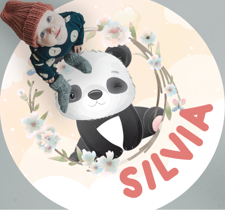 Reference: R19762A delightful panda character surrounded by floral elements. The design features soft pastel hues with a playful expression, ideal for kids. The personalized name is prominently displayed in a vibrant style, enhancing the charm of this engaging visual.