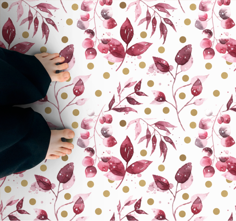 Transform your space with our stunning Floral vinyl rug botanical print design, featuring a beautiful hand-painted illustration that brings life to any room! The artistic design combines shades of burgundy, pink, and green with delicate leaves and intricate patterns, all elegantly highlighted with hints of gold. This watercolour masterpiece is not just a rug; it's a statement piece that radiates charm and sophistication!