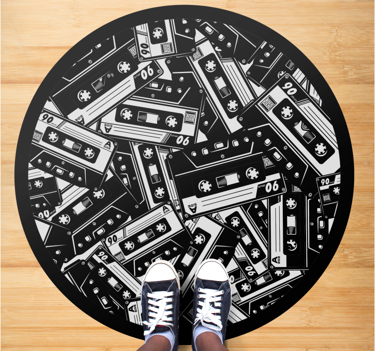 Reference: R19711A creative arrangement of cassette tapes fills the circular surface, featuring a monochromatic palette of black and white. The design highlights various angles and positions of the tapes, providing a nostalgic nod to music history and retro aesthetics.
