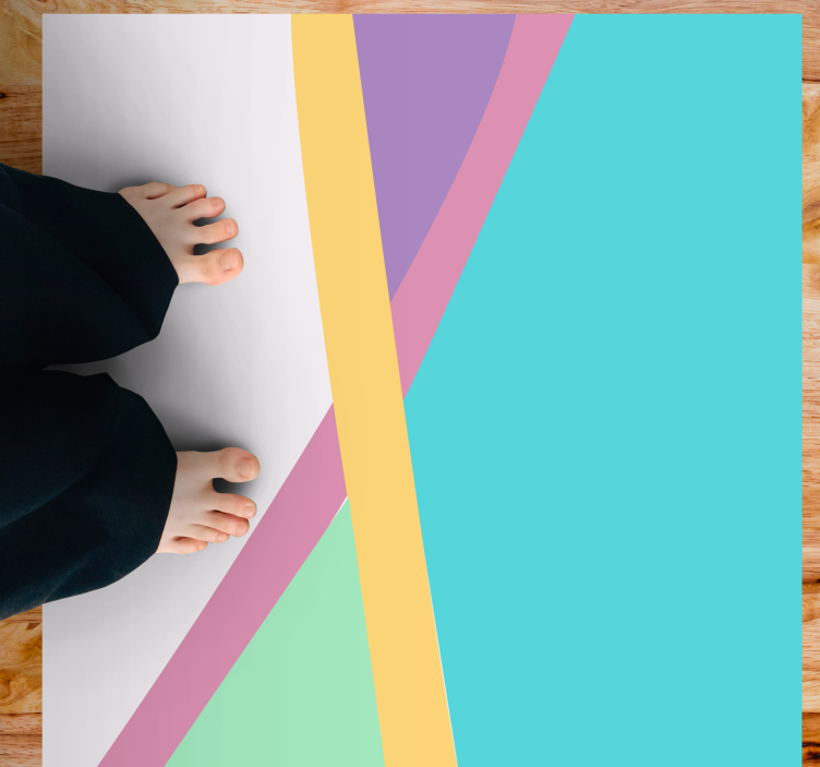 Transform your space with our Modern vinyl rug colorful abstract layers, where vibrant colorful stripes and geometric shapes come together in a stunning abstract design. The captivating blend of teal and pastel tones creates a visually striking piece that effortlessly enhances any room's aesthetic!