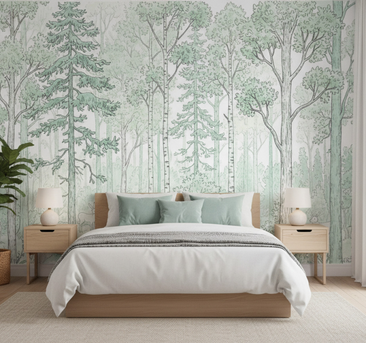 Reference: F11929Transform your space with our stunning Forest wall mural mint woodland illustration, a beautiful design that captures the essence of a serene woodland. With its soft mint colors and intricate details, this mural brings an enchanting forest atmosphere right into your home. The non-woven wallpaper material ensures a perfect finish, while its matte colors create a soft, inviting ambiance that complements any decor style.