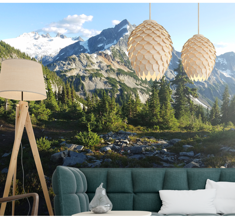 Transform your space with our stunning Landscape wall mural mountainous forest scene, where majestic mountains rise against a backdrop of snow-capped peaks and lush trees. This breathtaking design captures the essence of nature, immersing your home in a serene forest landscape that radiates tranquility and beauty!