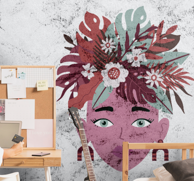 Invest in this modern woman and flowers marriage wall mural today and enjoy its unique elements that will enhance your home's beauty and ambiance. Correct all the grammar mistakes, keep the length of the description, keep everything in singular and put more H2 and H3 to make it richer in content.
